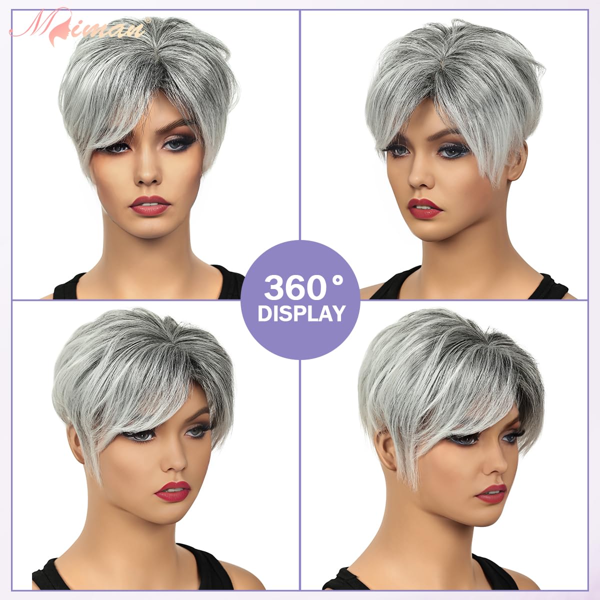 MIMAN Short Pixie Hair Toppers for Women Grey Fluffy Covering Hairpieces with Bangs Synthetic Pixie Topper for Thinning Hair Natura Looking Clip In Hairpieces