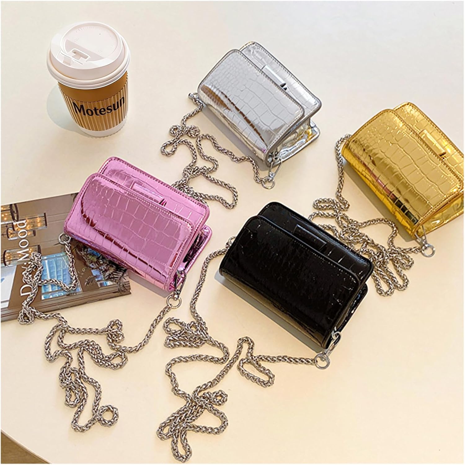 Mini Crossbody Bag for Women – Patent Leather Crocodile Purse with Silver Chain Strap, Small Clutch for Evening Party