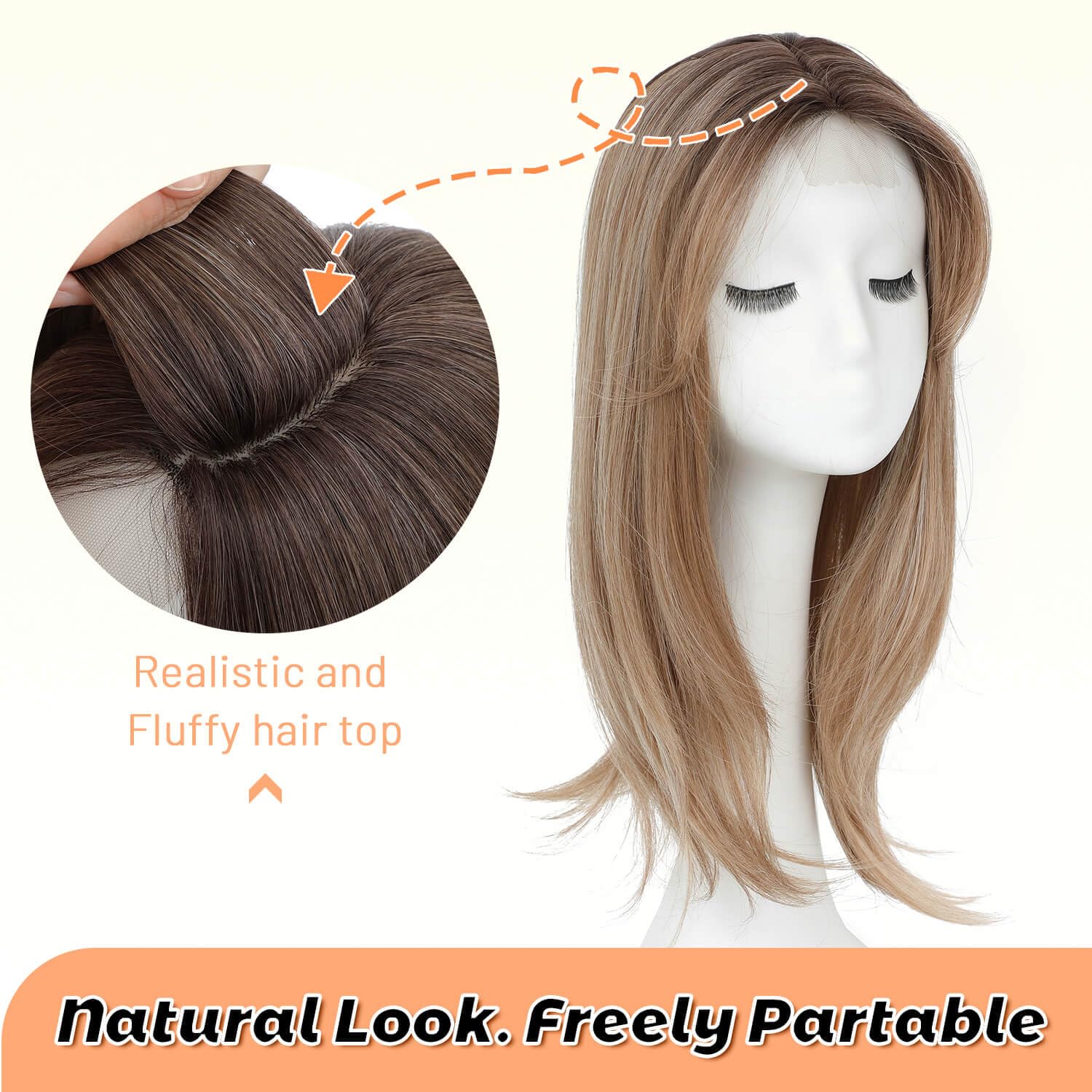 Ms Taj Hair Topper 18 Inch Hair Toppers for Women with Thinning Hair Long Layered 6.5″X6.5″ Synthetic Toppers Hair Pieces for Women Fiber Wiglets Ladies(Light Brown with Blonde Highlights)