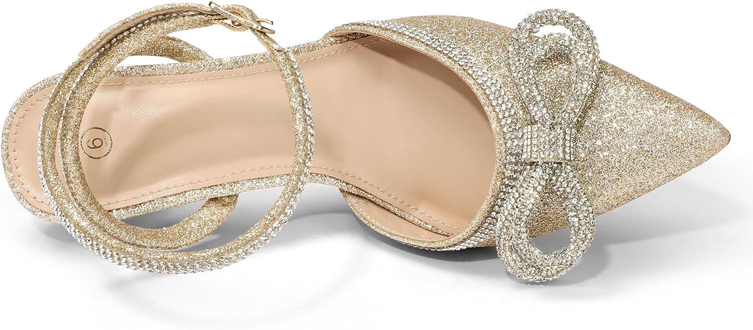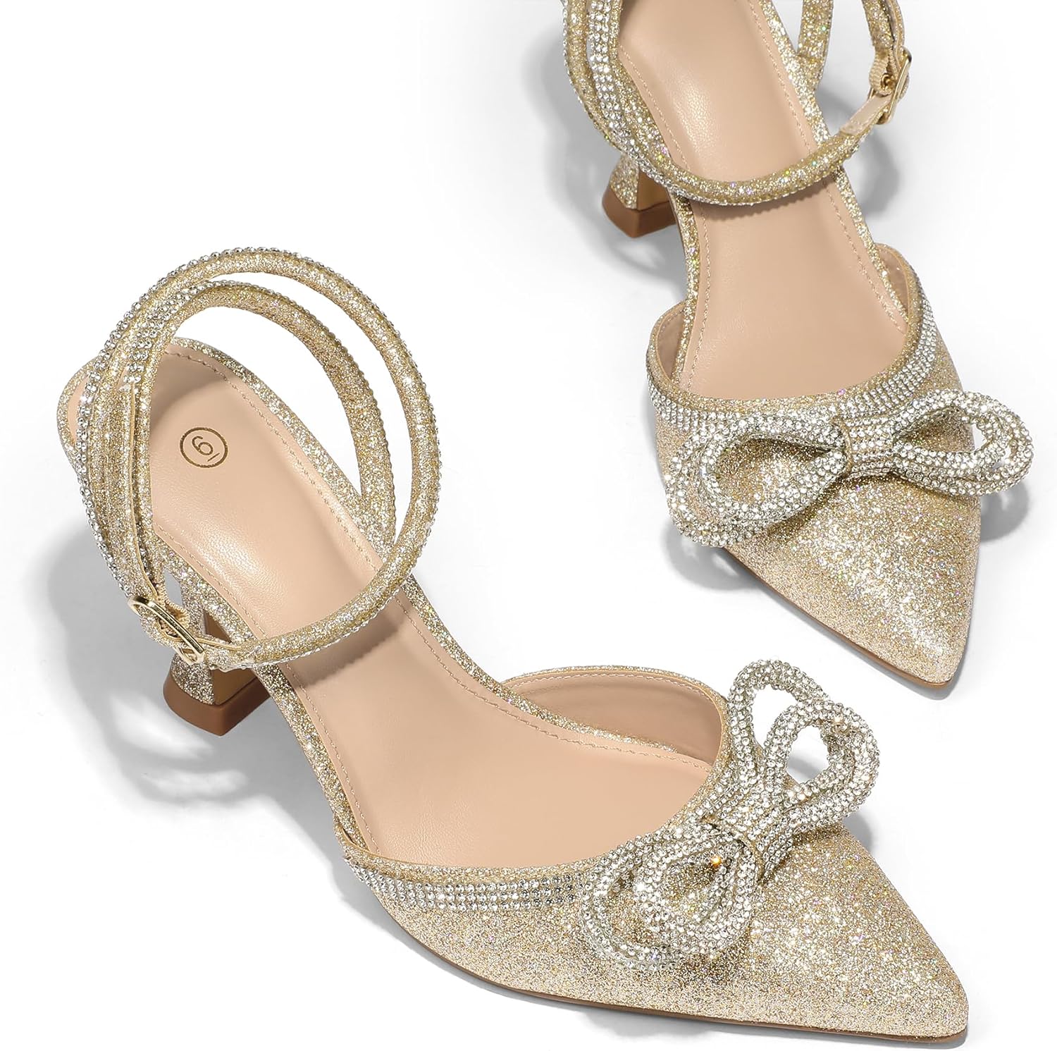 mysoft Women’s Rhinestone Bow Pumps Wedding Dress Shoes Pointed Toe Ankle Strap Kitten Heels
