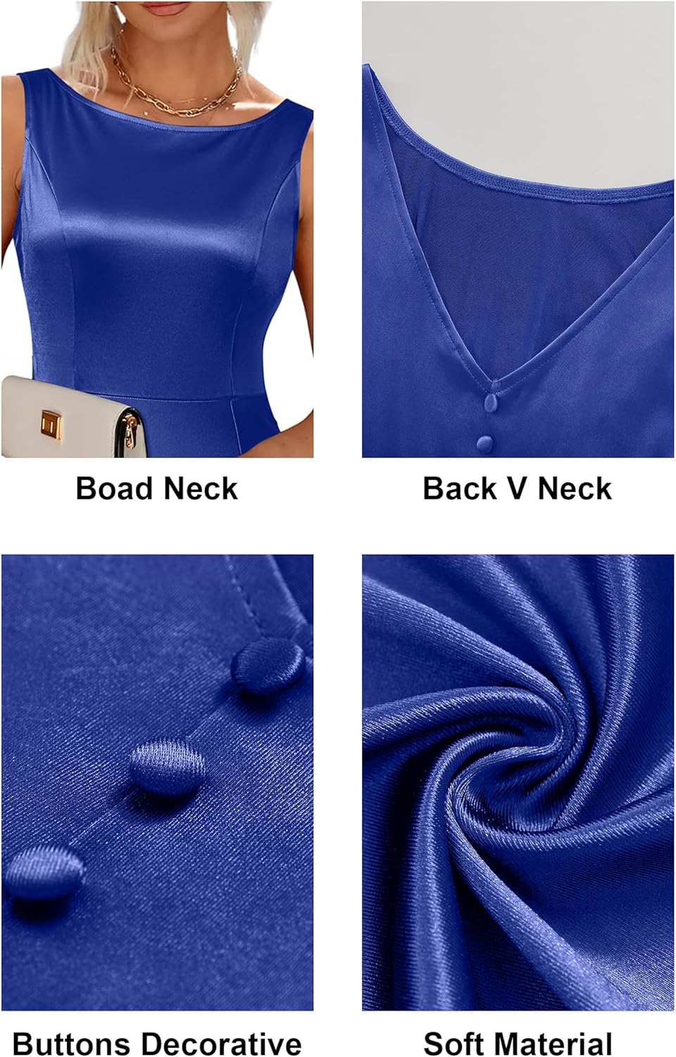 scoop neck, again v neck(ornamental buttons), aspect hiddden zippers, sleeveless , Mermaid Hem, exude your attraction
