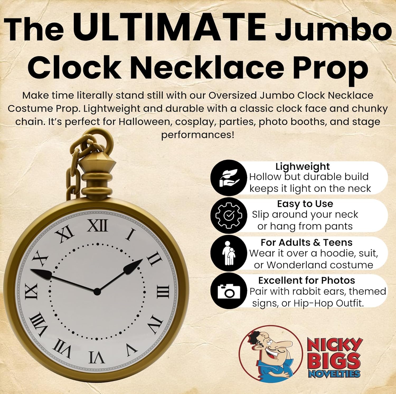 Make time actually stand nonetheless with the Nicky Bigs Novelties Jumbo Clock Necklace Prop—a towering 10″ clock face on a chunky 16″ chain, made for moments that demand consideration. From the enduring White Rabbit, to hip-hop Taste vitality, to theatrical Father Time vibes, this outsized costume clock is the daring centerpiece you want.