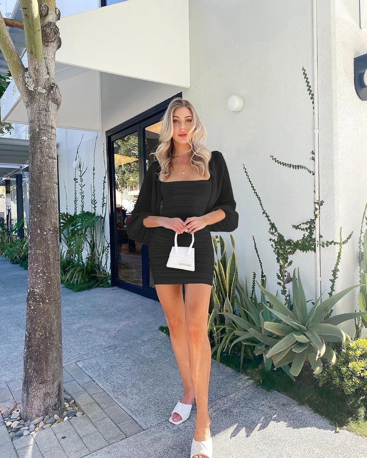 Ofenbuy Girls Mesh Lengthy Sleeve Sq. Neck Ruched Get together Membership Bodycon Mini Gown