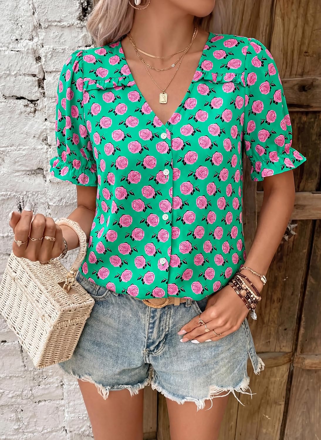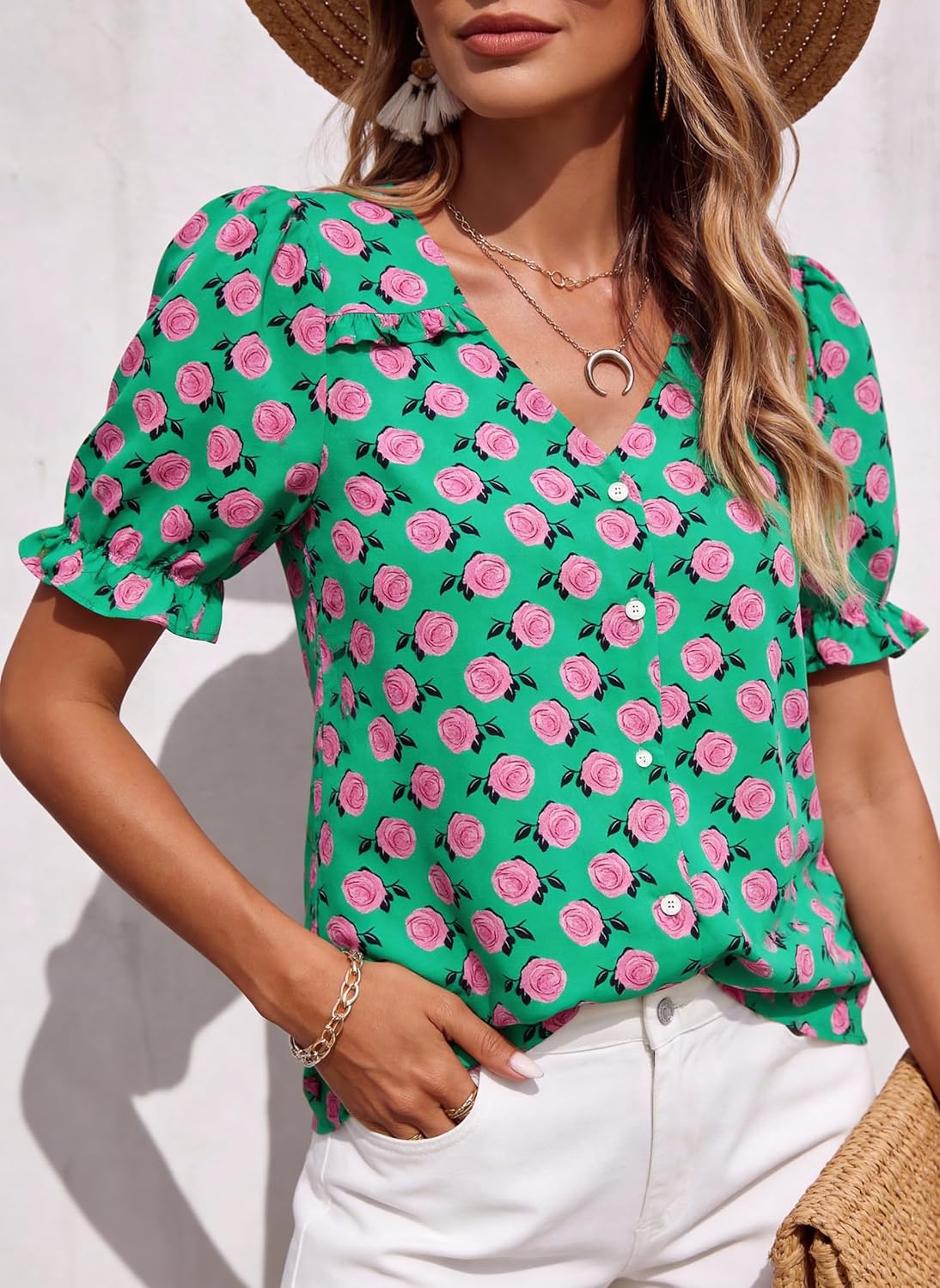 Deep v neck shirts; puff sleeve work instructor tops; cute and vibrant floral print tops; boho tops for ladies fashionable; informal bunisess outfits; floral spring blouses