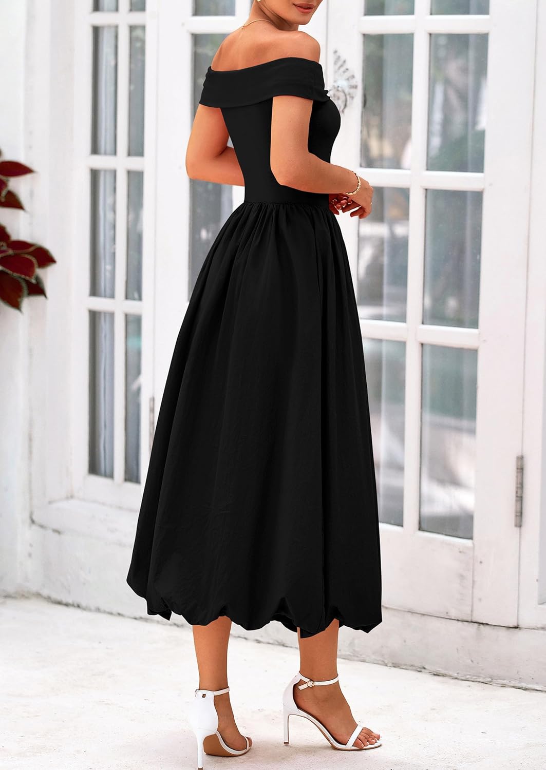 PRETTYGARDEN Womens Summer season Black Gown Fashionable Bubble Off The Shoulder Attire