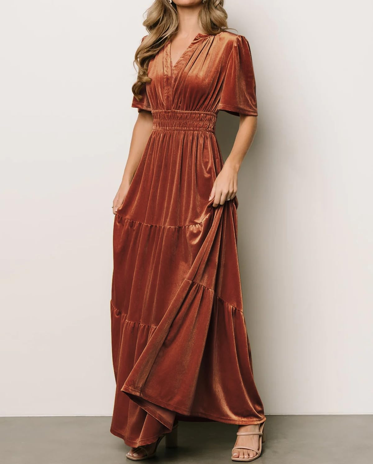 Women's Fall Winter Vintage Velvet Short Sleeve V Neck Elastic Waist Tiered A-Line Flowy Maxi DressWomen's Fall Winter Vintage Velvet Short Sleeve V Neck Elastic Waist Tiered A-Line Flowy Maxi Dress