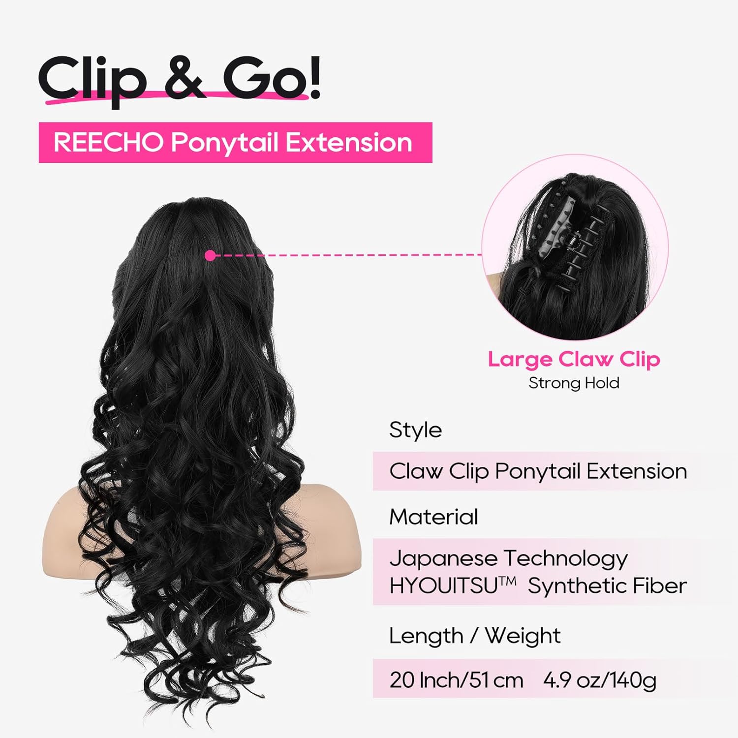 REECHO 20′ Claw Clip Ponytail Extension, Curly Clip in Ponytail Long Pony Tails Hair Extensions for Women, Fluffy Natural Looking Synthetic Hairpiece, Natural Black