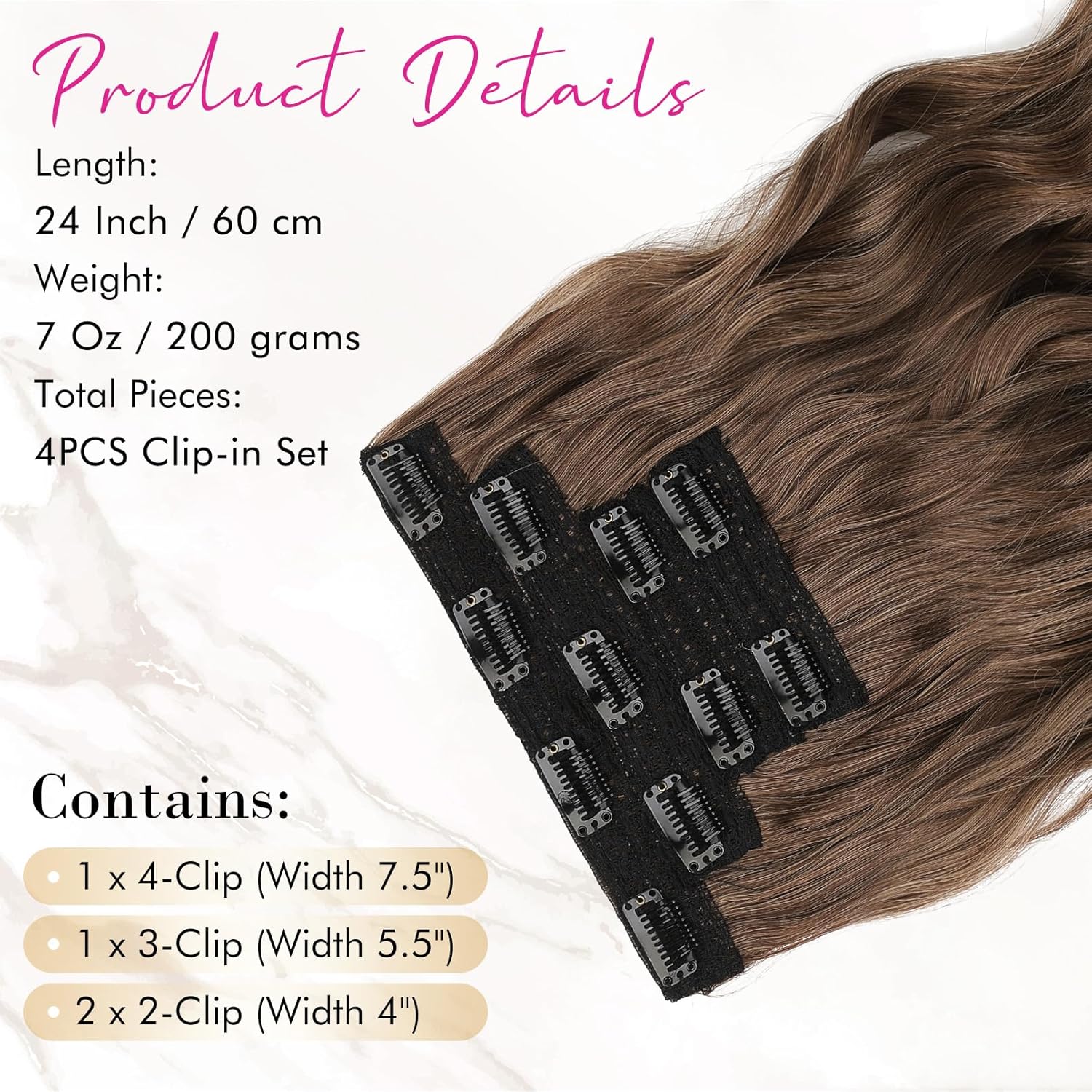 ✨ [What Come In] Every pack comes with 4 wefts for customizable placement on skinny or thick hair: 1 x 7.5″ width with 4 clips, 1 x 5.5″ width with 3 clips, 2 x 4″ width with 2 clips; size 24”; complete weight 200g