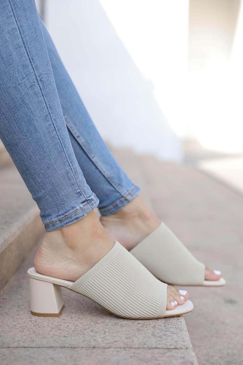 Rilista Women’s Open Toe Heeled Mules Block Heels Sandals Knit Chunky Square Heels Slip On Breathable Slides Sandal