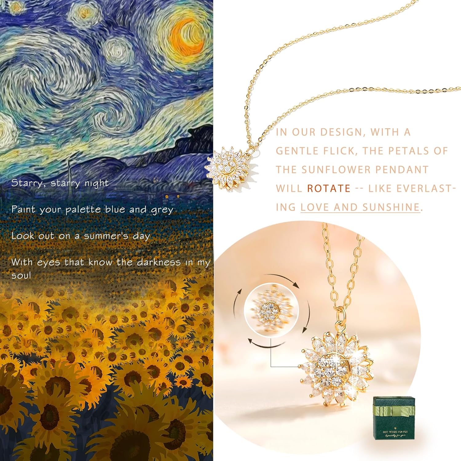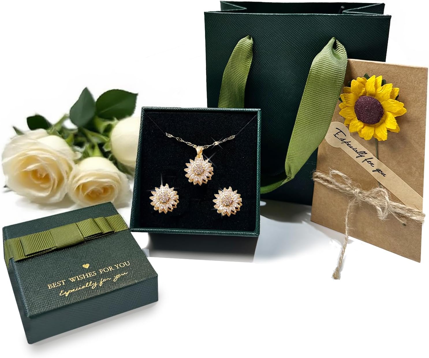 Rotating Sunflower Necklace & Earrings Jewelry Set | Gold-Finished Titanium Alloy with Sparkling Cubic Zirconia | Gift box + Tote Bag + 3D Card | Gift for Birthday, Anniversary or Mother’s Day | Sunflower Necklace for Women