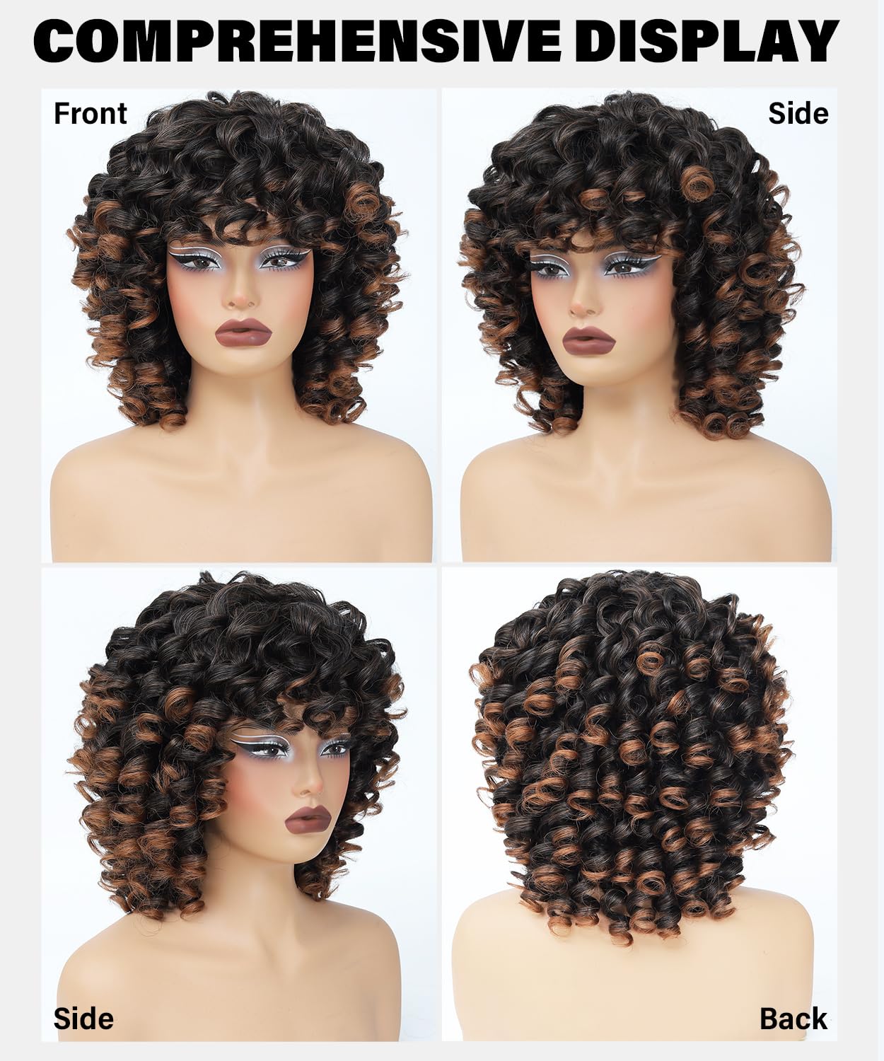Specs: Brief Free curly wigs for black girls, size: 14 inches, weight: 250g(8.82Oz), nclude One Wig Plus One Wig Cap. Adjustable Dimension,It Suits Most Folks’S Heads. You Can Return It If It Doesn’T Match Or You Don’T Like It