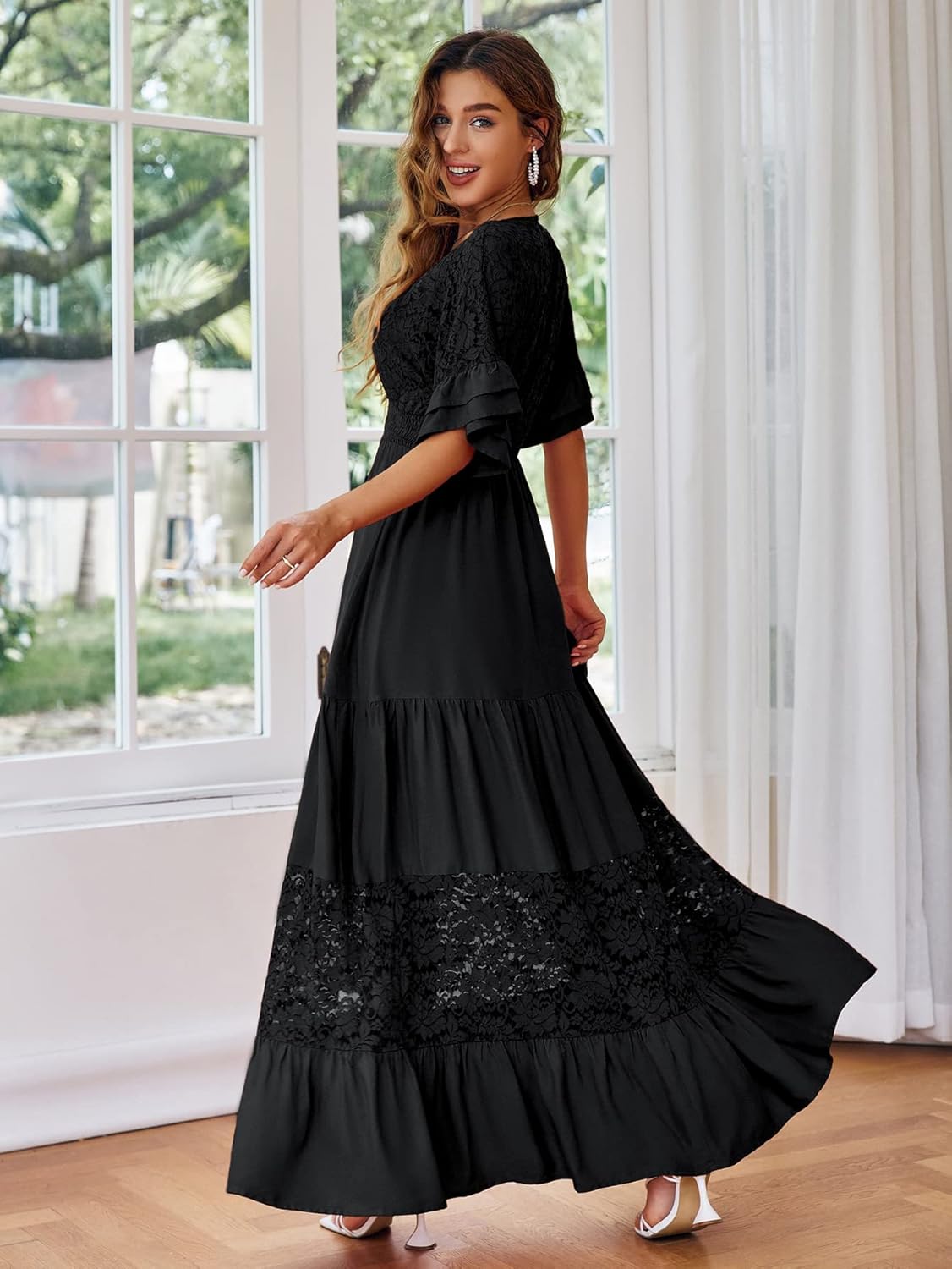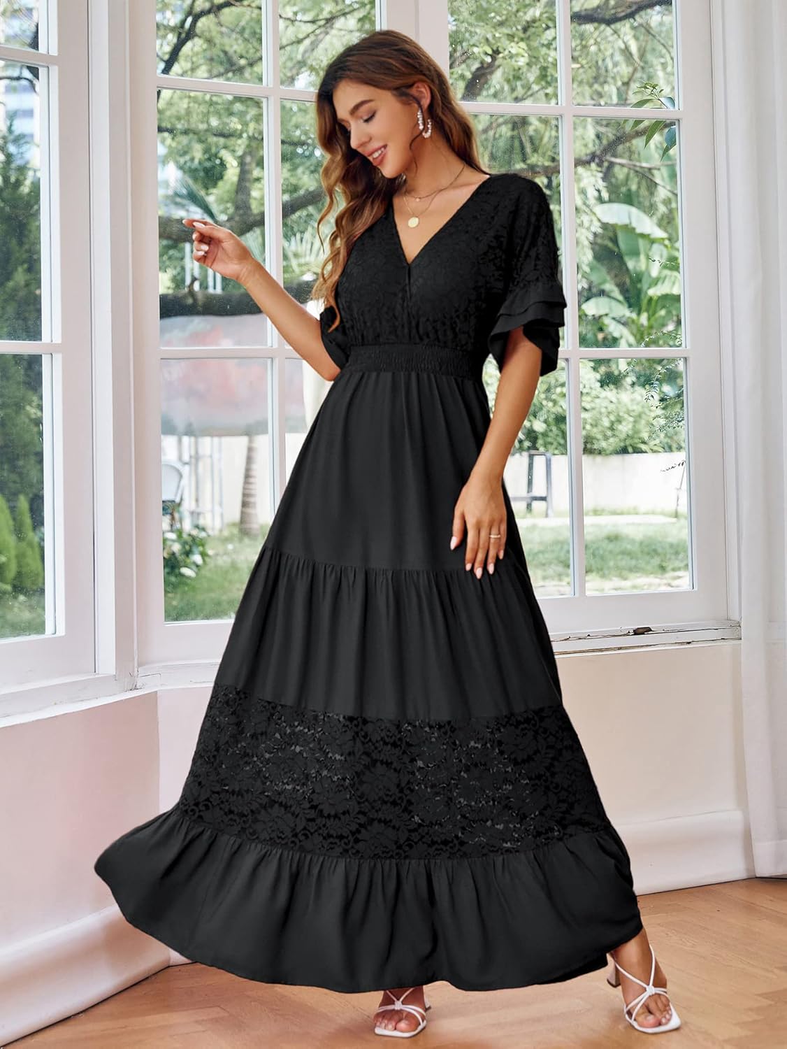 Simplee Women V Neck Formal Lace Maxi Dress Ruffle Flowy Short Sleeve Boho Wedding Guest Long Dress