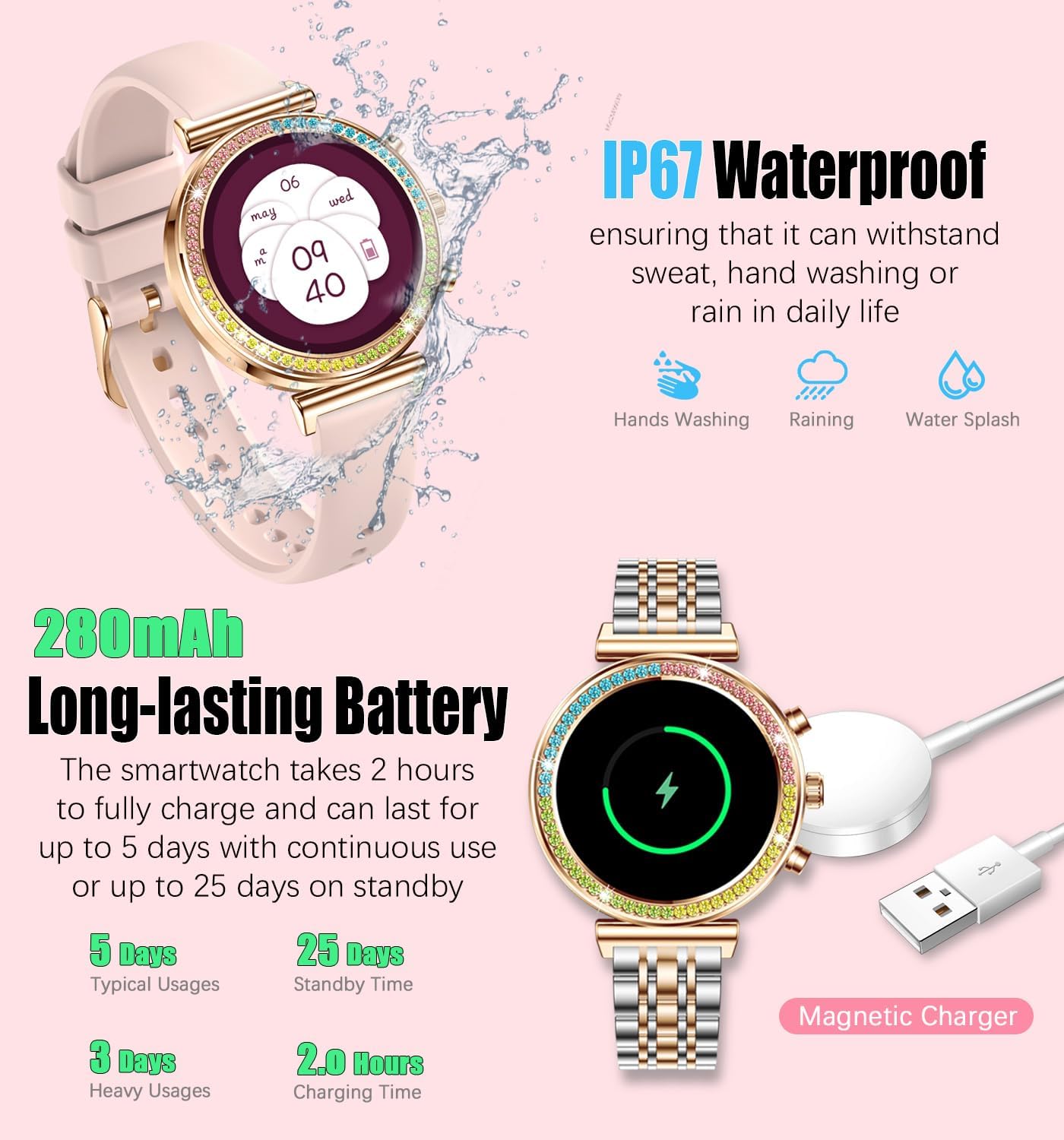 2 Straps & Multifunctional: The sensible watches for ladies include a sturdy chrome steel bracelet and a snug silicone strap. The ladies’s smartwatch helps IP67 waterproof, music management, distant digicam, climate updates, health monitoring, alarm, and extra