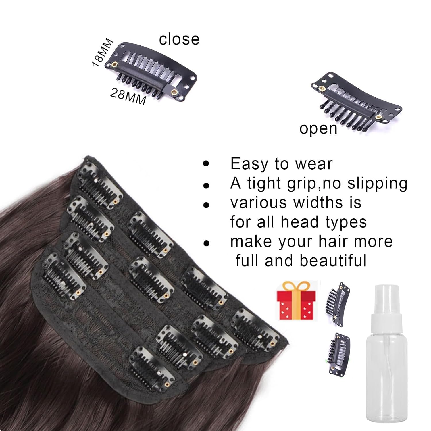 Package deal checklist: 2 items of 4.8 inches extensive 2 clips in wefts; 1 piece of 6 inches extensive 3 clips in weft; 1 piece of seven inches extensive 4 clips in weft; two items clips ;one piece of spray bottle
