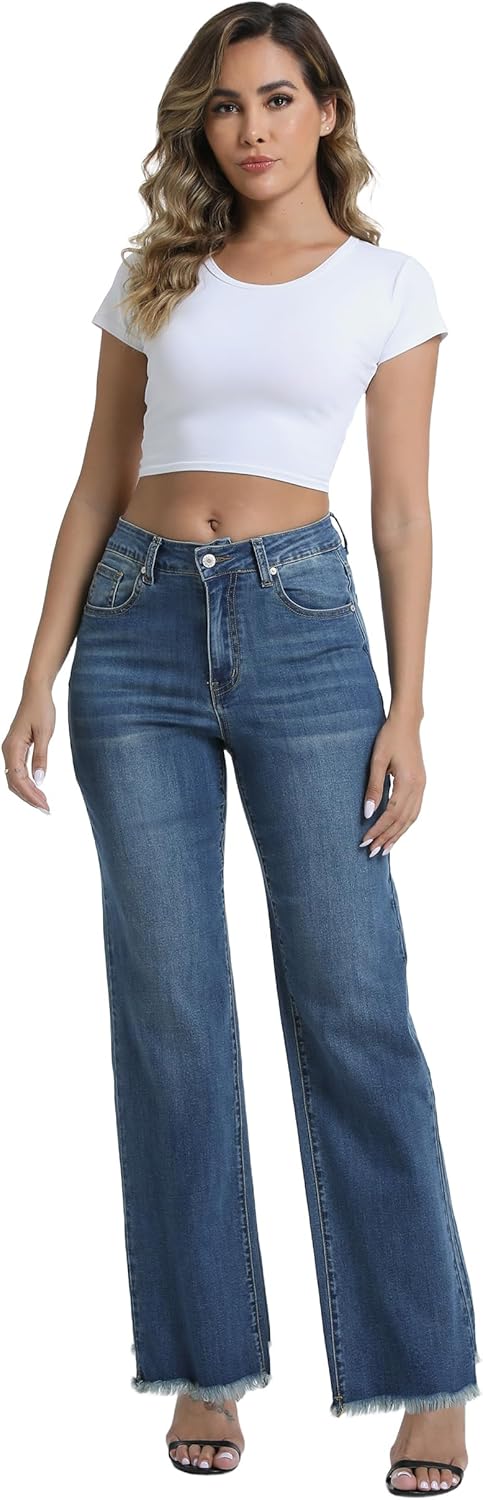 Girls’s Denims Straight Leg Excessive Waist Stretchy Uncooked Hem Fashionable Unfastened Denim Pants