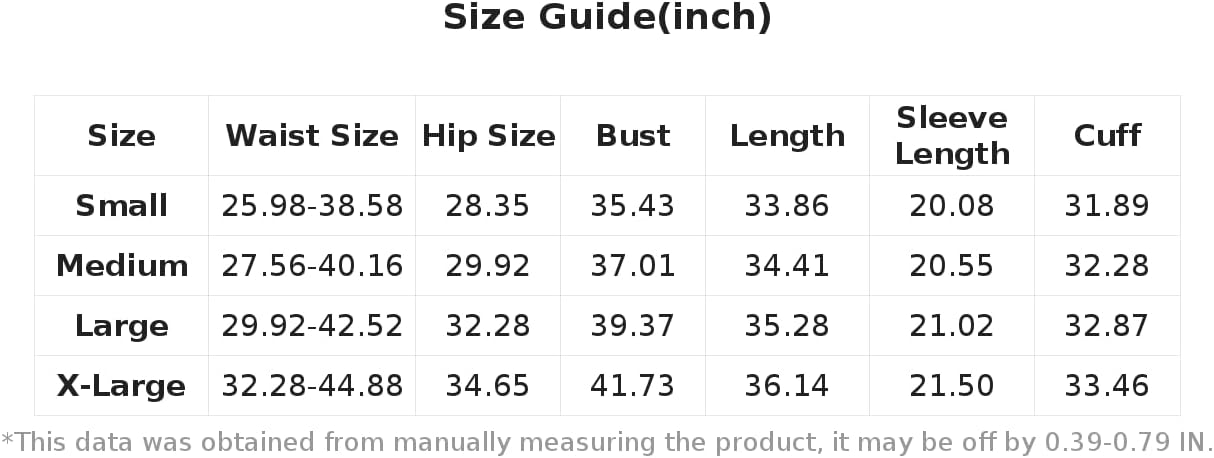 XL:Bust:41.7IN,Cuff:33.5IN,Hip Measurement:34.6IN,Size:36.1IN,Sleeve Size:21.5IN,Waist Measurement:32.3-44.9IN