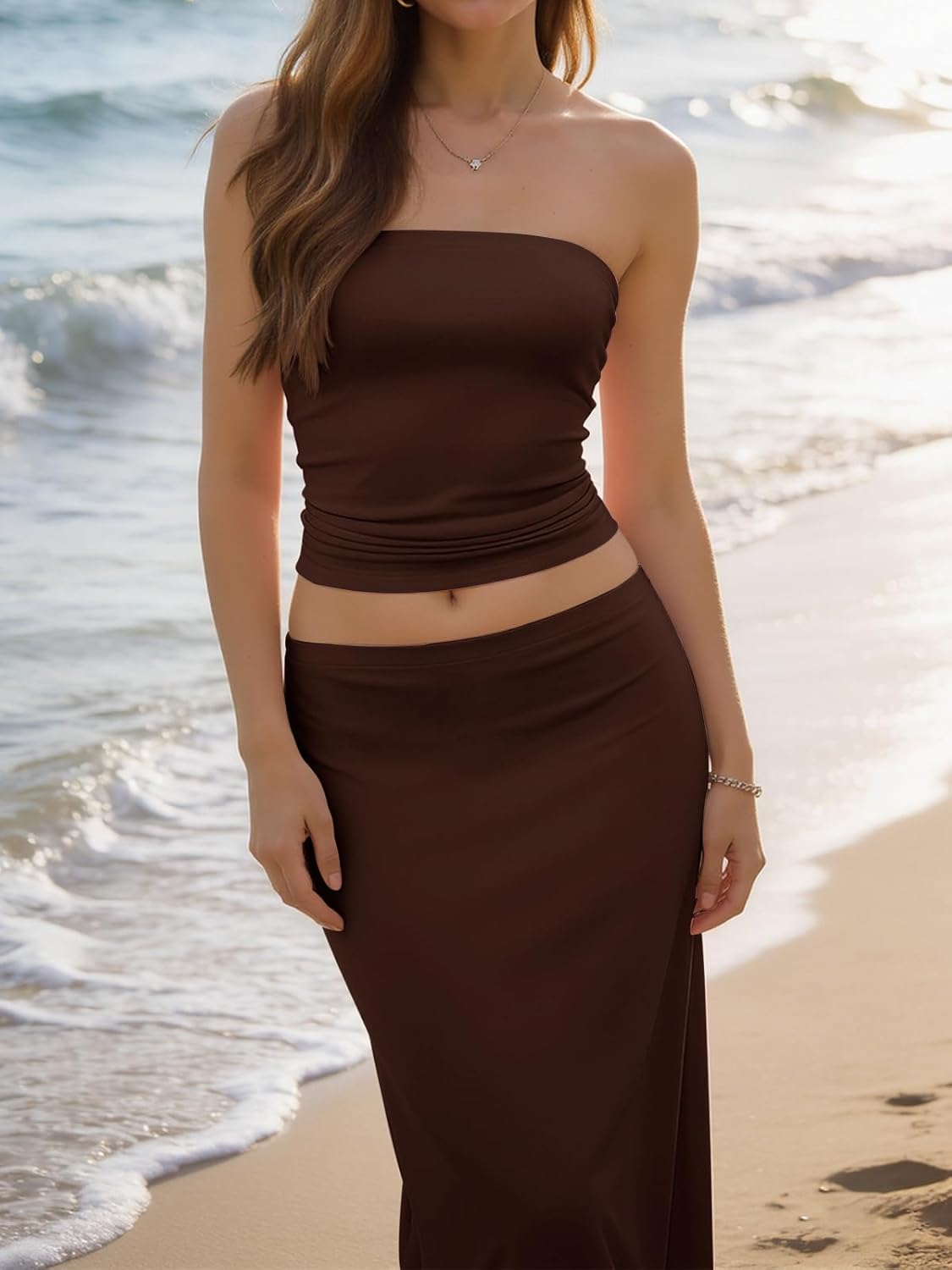 Tankaneo Womens Summer 2 Piece Skirt Set Strapless Tube Top and Bodycon Maxi Skirts Matching Sets Beach Vacation Outfits