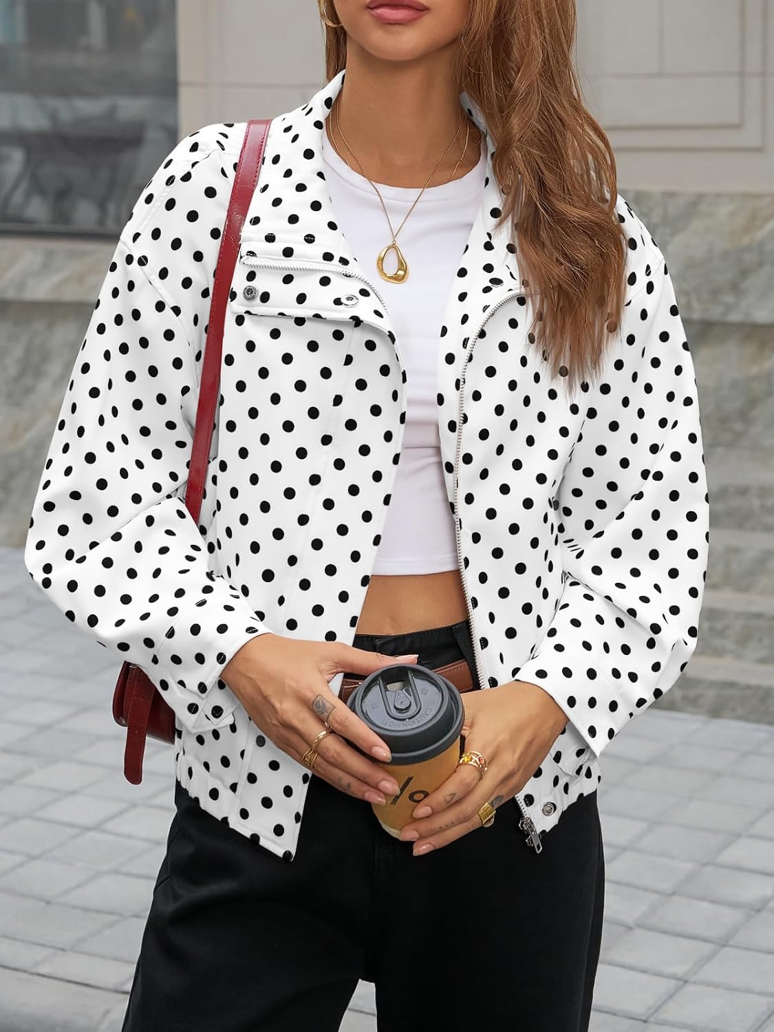 The video showcases the product in use.The video guides you thru product setup.The video compares a number of merchandise.The video reveals the product being unpacked. Womens Polka Dot Zip Up Cropped Jackets Service provider Video