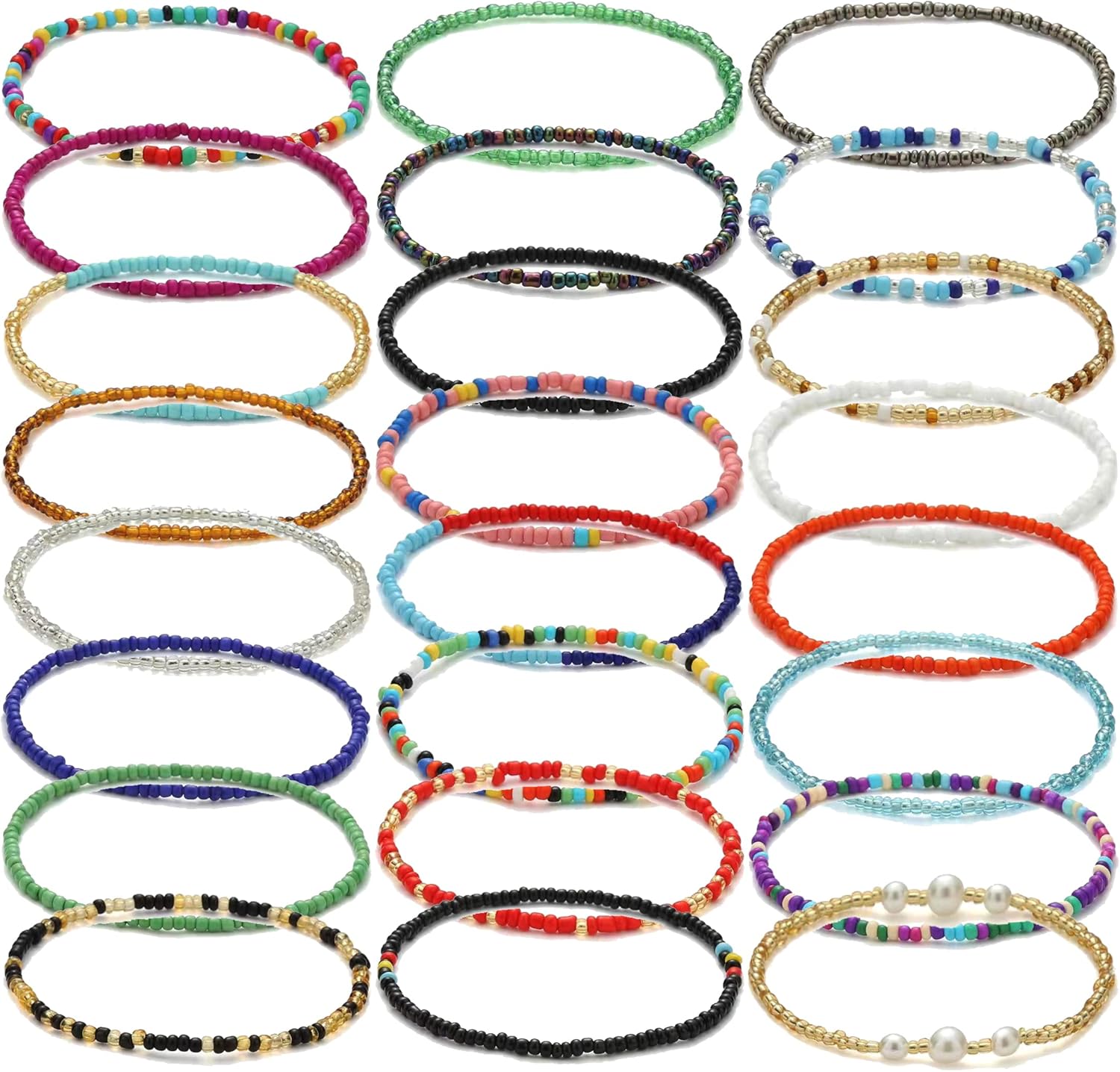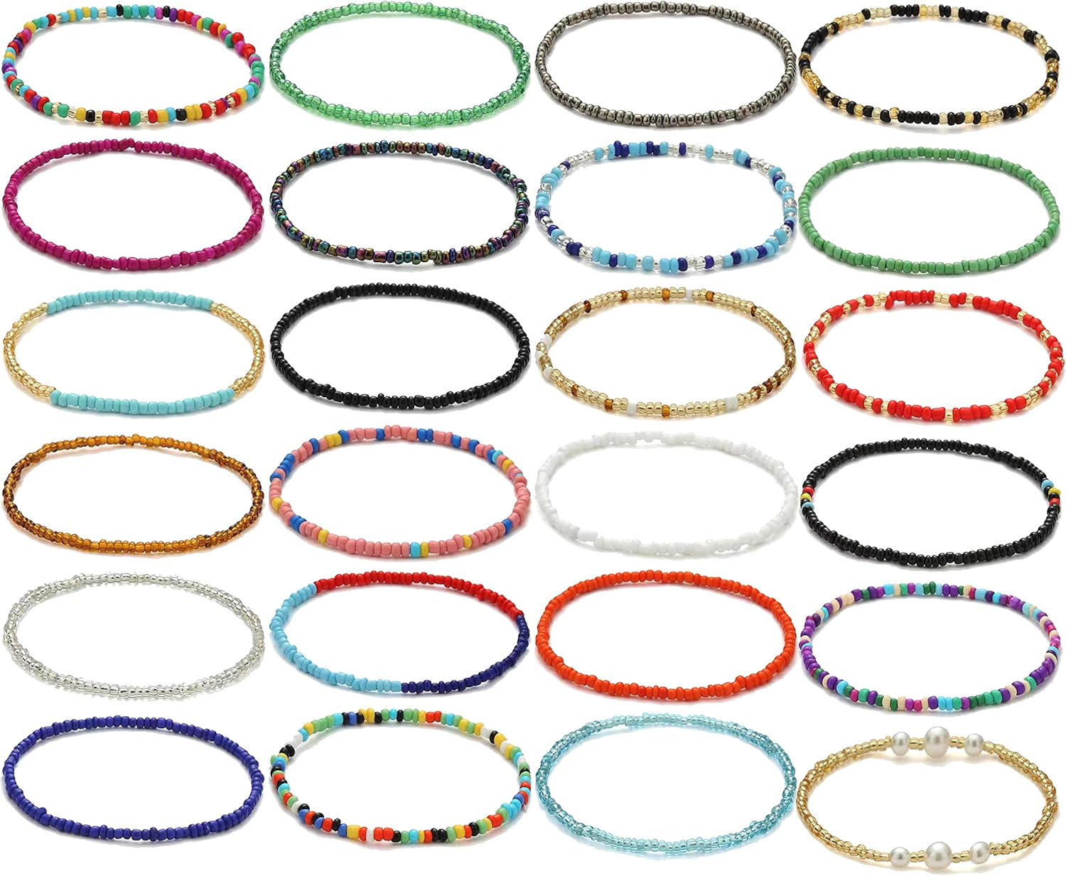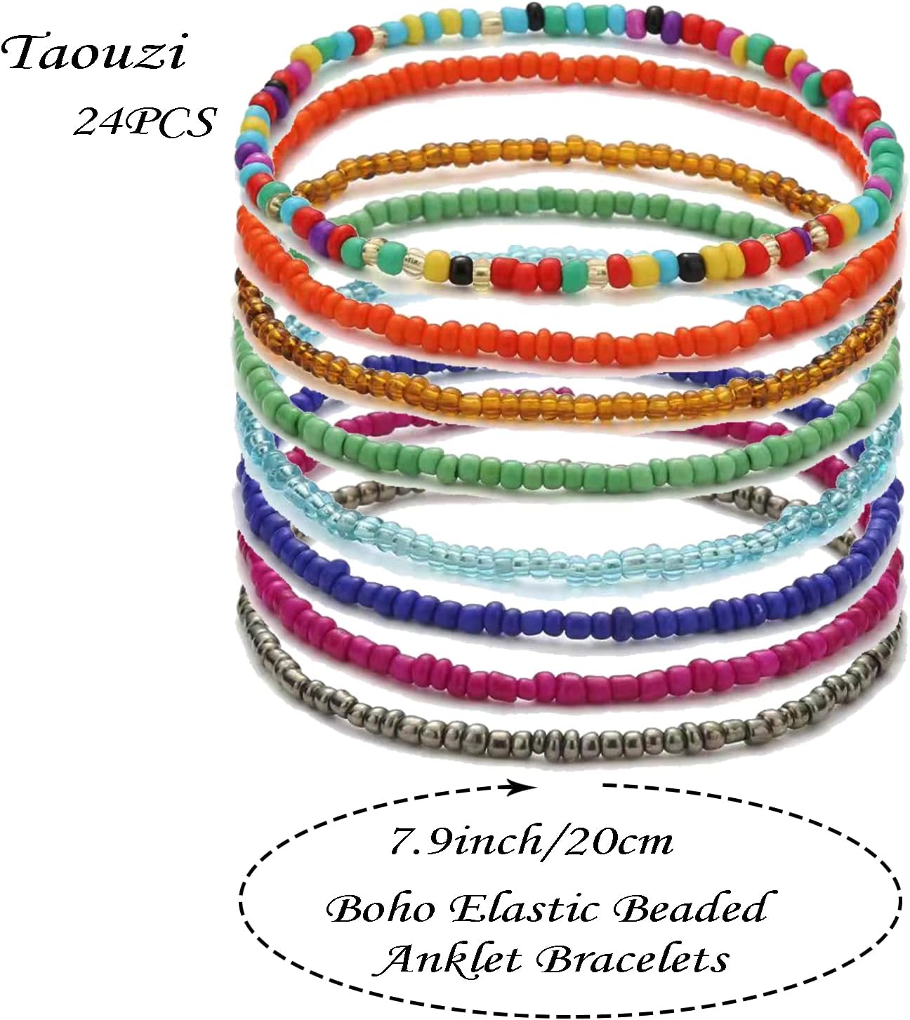 Taouzi 24PCS Beaded Anklets for Women Handmade Boho Beaded Ankle Bracelets Colorful Beads Foot Anklets for Women