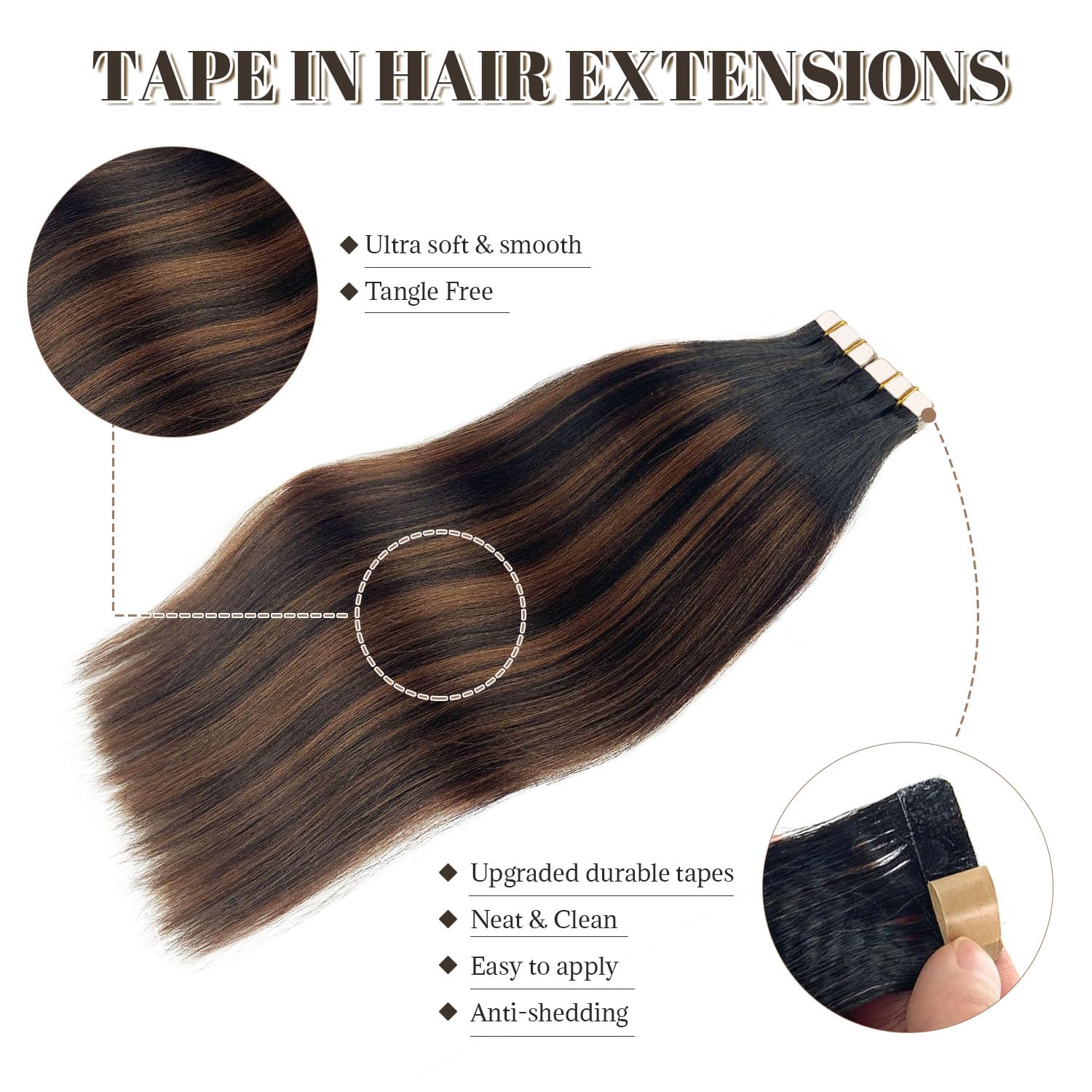 Yaki Straight Balayage Brown Highlights Tape in Hair Extensions Human Hair Tape ins for Girls