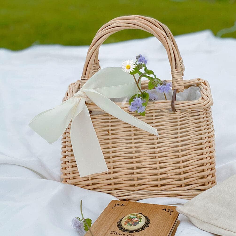 Vaguelly Wicker Handbag Bow Rattan Woven Bag Straw Bags Top Handle Wicker Baskets Purse Handbags Boho Style Beach Bag Flower Basket Straw Tote for Women Square Rattan Bag
