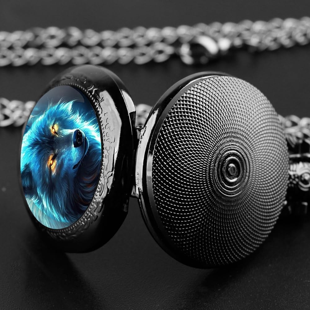 Vintage Wolf Design Glass Dome Quartz Pocket Watch with Durable Chain Arabic Numeral Dial for Men and Women Creative Gifts (TP-027)