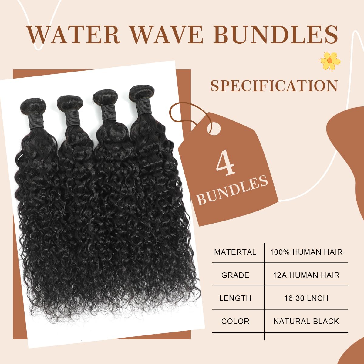 Human Hair Bundles Materials: 100% Unprocessed Brazilian Virgin Hair Water Wave Human Hair Bundles, Moist and Wavy Hair Extensions Lower from Younger Donors, Each Process is Inspected by Employee, Mushy and Bouncy, No Artificial Hair or Animal Hair Blended.