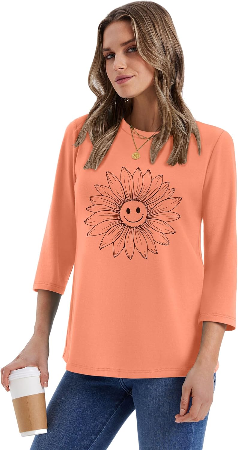 WIHOLL Womens 3/4 Length Sleeve Tops Crewneck Graphic Tees Casual Tunic Tops to Wear with Leggings Fashion Clothing Outfits