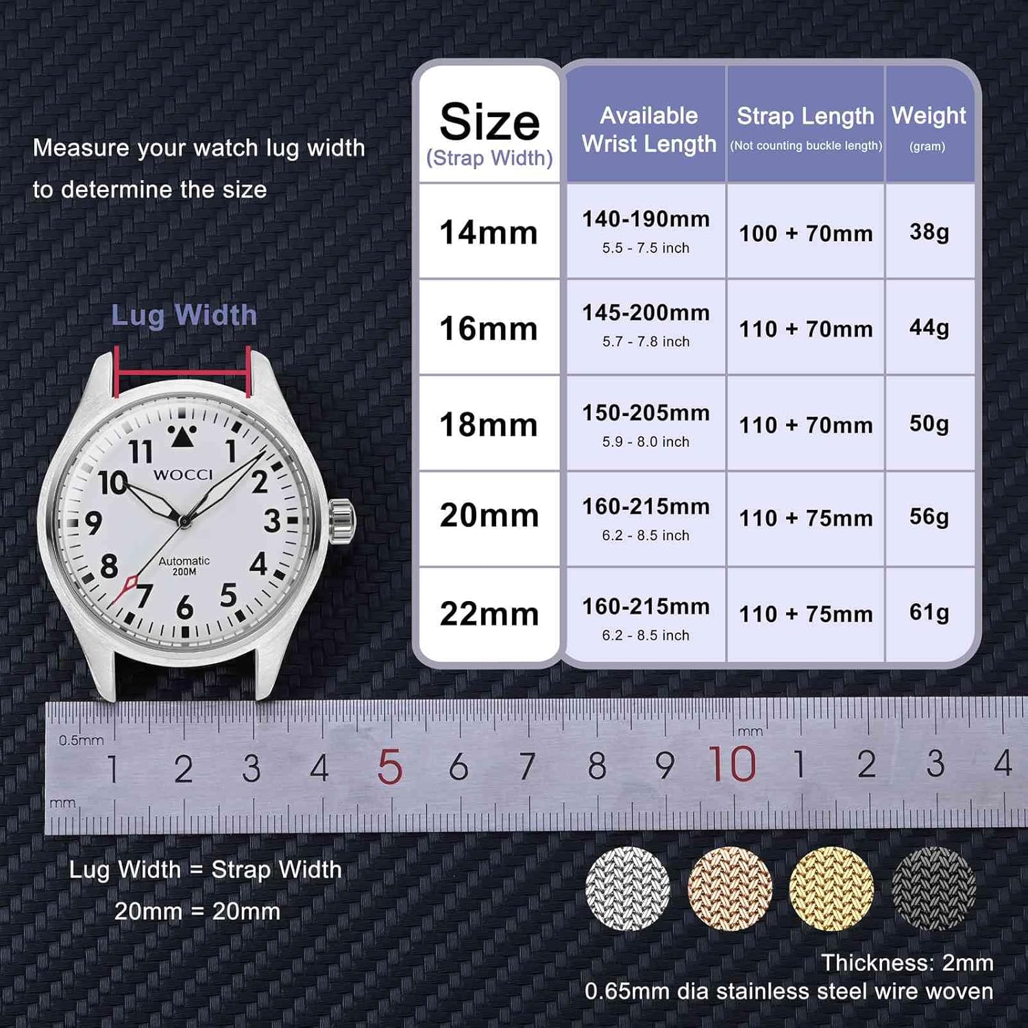 Measurement = Band Width = Lug Width WOCCI Metal Watch Strap 316L Stainless Steel Band Deployant Clasp 18mm 20mm 22mm 24mmWOCCI Metal Watch Strap 316L Stainless Steel Band Deployant Clasp 18mm 20mm 22mm 24mm