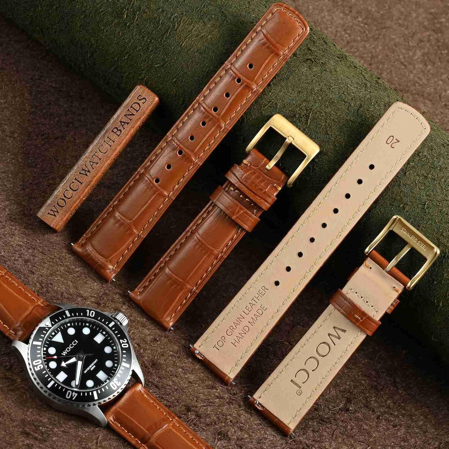 WOCCI Watch Bands, Top Grain Leather, Embossed Alligator Grain, Quick Release, Band Width 18mm 20mm 22mm
