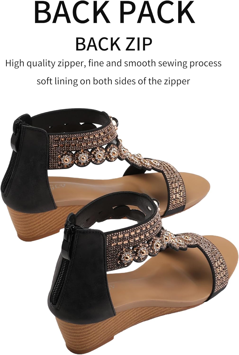 WOJWSKI Wedge Sandals for Women Bohemia Rhinestone Open Toe Roman Heel Zipper Summer Dressy Women’s Beach Casual Shoes