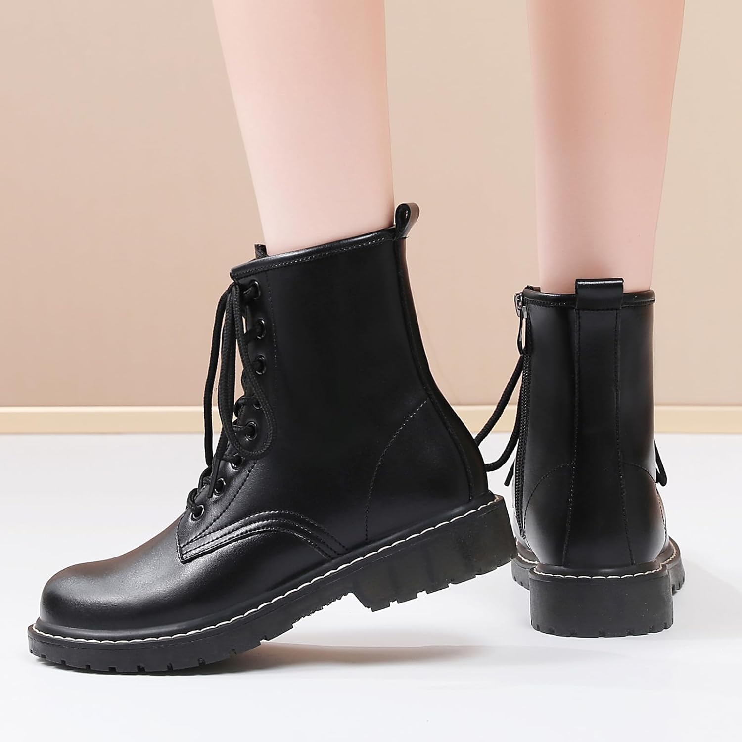 Women’s Combat Boots Womens Motorcycle Boots Ankle Booties Low Heel Side Zipper Lace-up Fashion Casual Short Boots