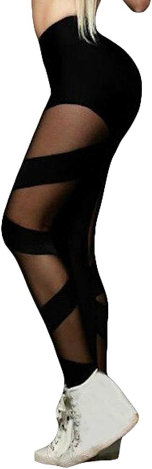 Women’s Leggings Mesh Panel Crossover Sports Yoga Pants High Waist Leggings See-Through Sweatpants