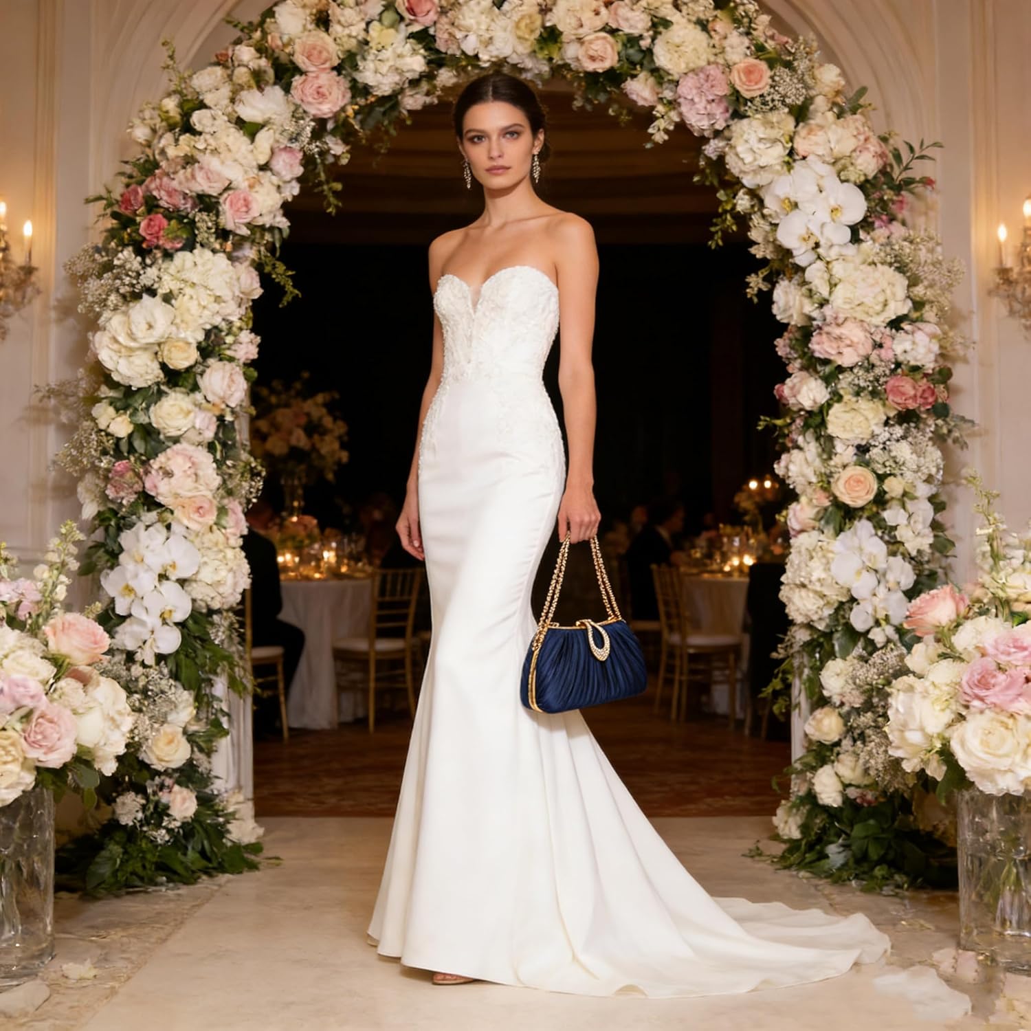 Silk-like Pleated Texture Gentle, lustrous fake silk with delicate pleating mirrors the opulence of ballroom evenings, draping fantastically in your hand or over your shoulder.Dazzling Crystal Embellishment A hand-set crystal teardrop clasp catches the sunshine, including a glamorous sparkle that turns heads at weddings, galas, and cocktail events. Versatile Rose Gold ChainThe removable rose gold chain enables you to put on it as a crossbody or carry it as a clutch, balancing practicality with refined luxurious for all-night consolation.Timeless Design A basic silhouette that enhances any formal apparel, making it a staple piece in your luxurious accent assortment for years to return.