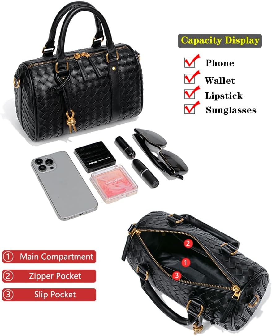 Womens Woven Boston Barrel Bag Vegan Leather Top Handle Purses Satchel Handbag Crossbody Bags