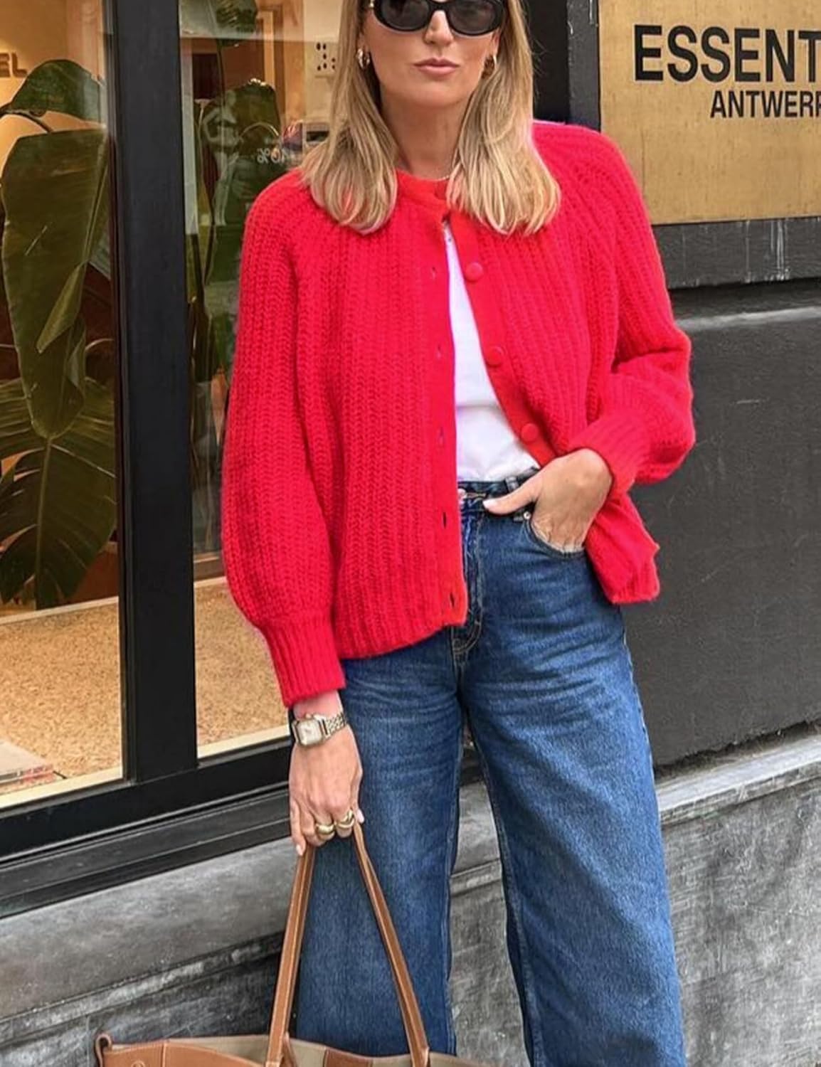 The ladies 2024 fall cardigan sweater is lengthy sleeve, button down, open entrance, spherical neck, dropped shoulder, strong colour