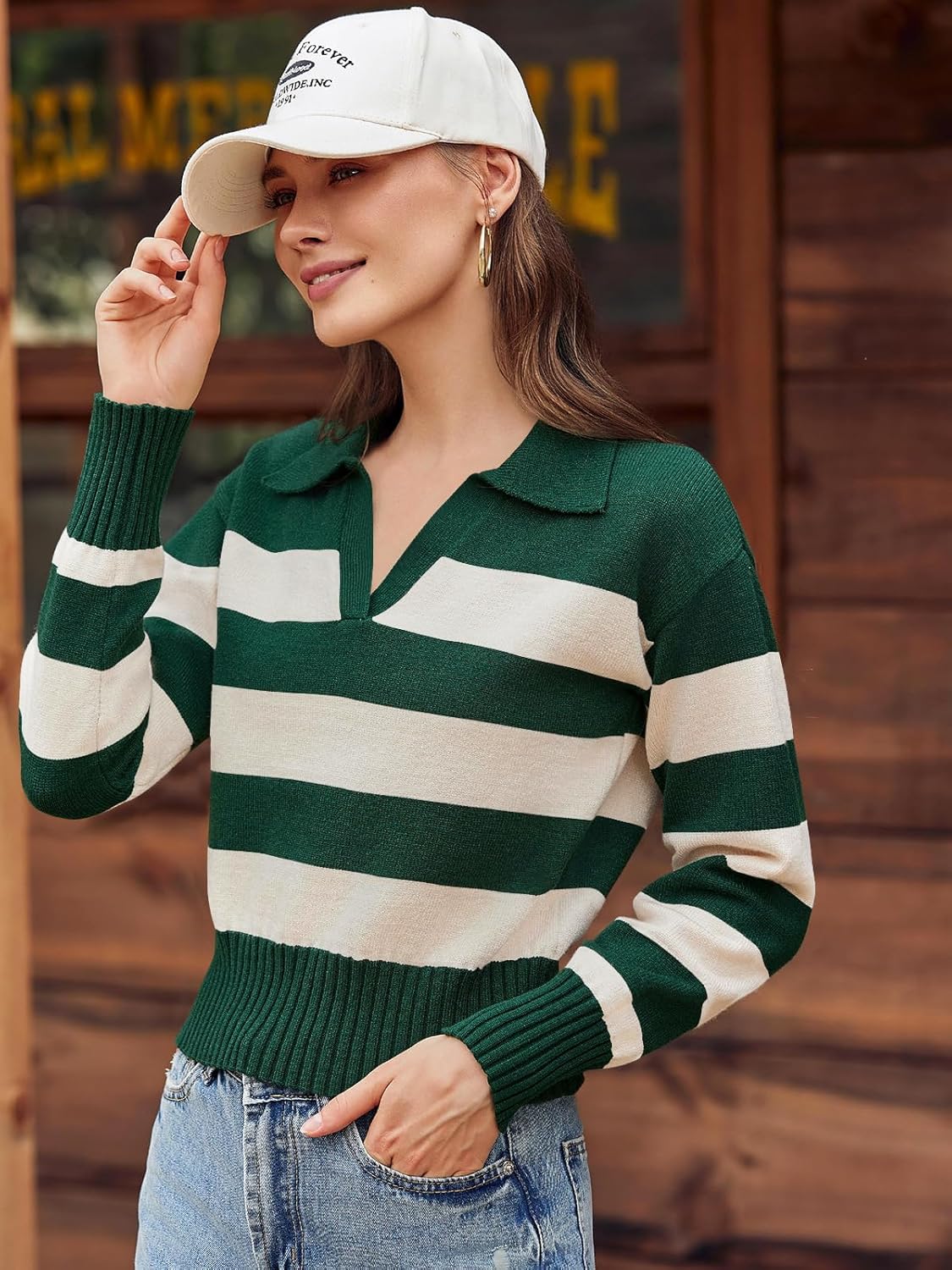Collared V Neck Lengthy Sleeve Striped Fall Sweaters for Ladies